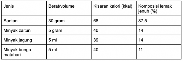 Usia (tahun) | Porsi lemak dari total kalori harian (%) | Jenis lemak |